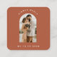 Cartes de boîtier RSVP modernes et tendance, avec photo en arc, arrière - plan en terre cuite, texte et code QR personnalisés. Ajoutez facilement vos détails en cliquant sur l'option "personnaliser ce modèle".