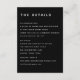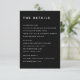 The Aesthetic: Provide your guests with essential information in a high-impact "Noir" style with this modern black and white enclosure card. This "information hub" utilizes a bold, architectural layout and our signature white Dongle typography to organize your wedding specifics into clean, sophisticated blocks. The deep black background acts as a gallery-style canvas, ensuring your details are as beautiful as they are functional. Industrial Clarity & Design: This card is engineered for maximum organization. We’ve pre-set the information into three distinct sections: Accommodations, Reception, and Wedding Website. To maintain the "industrial-chic" hierarchy, we recommend entering your details in all caps for the first two sections; then, use lowercase for your wedding website to create a visual contrast that helps the URL stand out. The Branded Monogram: This fully customizable template features a sophisticated white "L & G" couple's monogram on the back, serving as a striking "noir" signature for your suite. This designer touch ensures your stationery looks cohesive and high-end from every angle. Personalization & Quality: Easily update each block while maintaining the perfectly balanced editorial grid. For the best result, I highly recommend our Matte paper stock for a deep, velvety black finish—its tactile feel is the perfect match for the "Signature Palette" aesthetic. A Designer’s Pro-Tip: This enclosure card is designed to sit perfectly behind your invitation and RSVP card. By keeping your secondary details on this dedicated black card, you create a striking "layered" look that keeps your main invitation suite feeling like a clean, minimalist work of art.