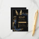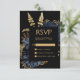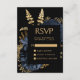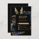 Cette carte élégante et moody mariage RSVP boîtier dispose d'un bouquet floral luxuriant et romantique en bleu marine avec fausse feuille d'or et feuillage de parties scintillant sur un arrière - plan noir. Customisez le texte de couleur or dans des polices stylisées sur un rectangle noir. Le dos de la carte est noir.