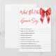 Ajoutez de la gaieté et de l'amusement à la fête de mariage avec cette carte de jeu chic “Qu'a dit le marié ?” avec un design élégant à nœud rouge. Les invités essaient de deviner les réponses du marié à des questions drôles et gentilles sur la future mariée, ce qui en fait un excellent jeu d'ambiance et un souvenir. Élégant et moderne, cette carte est facile à personnaliser et se marie parfaitement avec un thème de fête de mariage à nœud rouge.