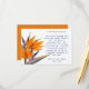 Cartes de vœux avec message pour un mariage à insérer près d'un puits de souhaits. Dessin d'oiseau de paradis orange et texte imprimé en bleu sur des cartes horizontales de petite taille. Utilisez le message type, ou modifiez-le selon vos besoins. Idéal pour être inclus dans les invitations de douche et / ou de mariage. Une façon élégante de demander des cadeaux en argent à vos invités plutôt que des cadeaux. Le verso est orange uni. Illustré sur du papier écru avec d'autres options.