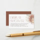 Cette carte de douche à écran de bouho présente d'élégantes orchidées aquarelles, de l'herbe de pampas et des feuilles de palmiers séchés dans des tons doux et neutres. C'est une façon réfléchie de faire savoir aux clients que les cadeaux peuvent être déemballés plus tard et affichés à la place. Idéal pour des baby showers modernes, rustiques ou sans sexe. Insérez la carte avec votre invitation à partager doucement la tradition de douche d'affichage. Tous les termes sont modifiables pour correspondre au ton et aux détails de votre événement.