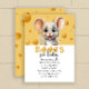 Une petite souris est en route, Fêtons aujourd'hui ! Design baby shower mignon avec script tendance et petite souris mignonne sur motif de fromage.Le texte peut être facilement personnalisé pour un design unique d'un type pour votre journée spéciale.