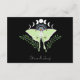 Un bouillonnant papillon de nuit vert est entouré de phases de lune et de feuilles verts luxuriants contre un arrière - plan noir profond.