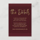 Cette superbe carte d'information mariage dispose d'un arrière - plan de couleur bordeaux avec des bordures plus légères assorties aux couleurs du vin, et d'une typographie manuscrite moderne. Un look simple et contemporain avec un texte en faux or gras. Vous pouvez utiliser ces cartes pour inclure des informations sur la réception de votre mariage, les itinéraires routiers, l'hébergement et tout ce que vous avez besoin de connaître de vos invités.
