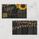 Faire-part de mariage de tournesol élégant rustique MINI SIZE carte de boîtier de réponse en ligne avec code QR à balayage (généré automatiquement) sur un arrière - plan en bois de grange brun foncé avec des cordes de lumières scintillantes. ++++++++++ Papier à lettres correspondant disponible dans la collection.