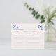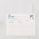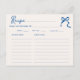 Célébrez les prochaines noces de votre future mariée préférée avec style avec nos cartes de recette de baby shower originales et fantaisistes ! Cette carte présente un magnifique nœud papillon bleu dessiné à la main dans un style amusant et ludique et un verso rayé avec des bandes verticales bleues douces. La police de caractères manuscrite décontractée capture parfaitement l'excitation et la joie de l'occasion.
