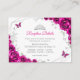 Fuchsia pink silver and white floral Quinceanera reception details enclosure cards. Features, script font, silver butterflies, watercolor roses and tiara. Perfect for an elegant princess style glam celebration. Personalize with your own details.