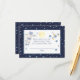 La couche spatiale tombole avec étoiles bleues sur arrière - plan bleu minuit. Chaque carte a un vaisseau spatial, un vaisseau spatial et une lune jaune pâle sur un arrière - plan blanc. Joignez dans l'enveloppe les invitations correspondantes.
