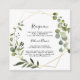 Cette carte de réception de mariage espagnole feuille tropicale est parfaite pour un mariage moderne. Le design présente de beaux feuilles verts peints à la main, ornant un cadre géométrique doré.