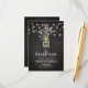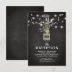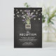Cartes de réception de mariage country chic avec un fond de tableau noir rustique, des lumières de guirlande, un pot Mason avec des fleurs de lavande violettes, enveloppé dans une toile de jute avec les initiales du couple et un modèle de réception du soir élégant et facilement personnalisable.