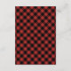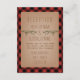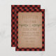 Une carte de réception de mariage rustique avec une illustration de branches d'arbres persistants. Le fond est à carreaux rouge et noir.