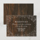 Une carte de réception de mariage rustique et élégante avec une bordure de fleur de bébé sur un fond inspiré du bois de grange.