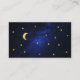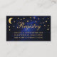 Une carte de boîtier marine et or mariage pour un mariage céleste : texte doré sur un arrière - plan de nuit étoilé, entouré par la lune et les étoiles (qui sont faux feuille or). Le titre Registre est écrit dans un élégant script calligraphique. Le texte est centré.