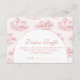 Celebrate a timeless and romantic baby shower with this elegant pink toile design, featuring delicate vintage countryside illustrations in soft blush tones. The refined arch layout creates a beautiful focal point for your event details, blending classic European charm with a modern, feminine aesthetic. Perfect for a chic, storybook-inspired celebration, this design feels both graceful and effortlessly sophisticated—ideal for creating a memorable and stylish gathering.
