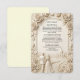 Invite guests with timeless elegance using this classical scenic design, featuring a romantic monochromatic palette and simulated stone relief details.This design features a sophisticated trompe l'oeil technique that simulates the look of a three-dimensional stone carving. A sculpted floral border of lush roses frames a serene vignette of a bride and groom walking away down a winding cobblestone path toward a distant country chapel nestled in rolling hills. The color palette utilizes soft shades of cream, ivory, and beige to enhance the faux bas-relief effect, creating shadows and highlights that suggest architectural depth. The text is presented in a traditional serif typography, maintaining a formal and clean layout structure.