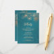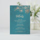 Rose gold floral line art cherry blossoms on a shimmering teal background. Matching wedding invitation available.