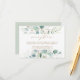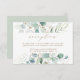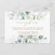 Cette carte d'enceinte de réception de mariage est composée d'eucalyptus à l'aquarelle peinte, de feuilles de parties scintillant botanique vert et or avec script or.