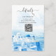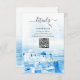 Blue Santorini Grèce aquarelle destination détails de mariage carte d'enceinte avec un code QR. Il présente une image d'aquarelle rêvée qui capture le charme unique de Santorin. Plutôt qu'une représentation strictement réaliste, la carte présente une vision imaginaire et pittoresque de l'île, avec ses bâtiments blanchis à la chaux caractéristiques qui descendent les falaises et s'ouvrent sur une vue panoramique sur l'océan. La carte utilise les bleus vibrants du ciel égéen, avec des mouettes peintes pour transporter vos invités vers la magie de la Grèce. Utilisez cette carte pour informer vos invités sur les détails essentiels de l'événement à venir d'une manière à la fois informative et belle. Le design s'inspire du charme romantique de la Grèce, de ses vues panoramiques à couper le souffle et de l'architecture caractéristique de l'île pour créer une première impression mémorable.