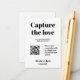 La *Bold Script Capture The Love QR Code Encape Card* sur Zazzle combine élégance moderne et fonctionnalité. Doté d'un script audacieux et d'un code QR personnalisable, cette carte vous permet de partager sans effort votre histoire d'amour, vos détails mariages ou vos souvenirs spéciaux avec vos invités. Il suffit d'analyser le code pour accéder au contenu personnalisé, tel qu'un site Web mariage, un album photo ou un message vidéo. Parfait pour les mariages, les fiançailles ou toute célébration, cette carte ajoute une touche personnelle et contemporaine à votre événement. Conçu avec des matériaux de haute qualité, c’est une façon mémorable et élégante de faire participer vos invités tout en améliorant votre célébration.