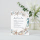 Détails du mariage sur la plage La carte de l'enceinte comporte une couronne d'aquarelle avec anneaux dorés rustiques, étoiles de mer, coquillages et hippocampes. Les détails du mariage peuvent être personnalisés et sont dans une police bleue poussiéreuse. Parfait pour les thèmes plage, nautique, tropical, destination et côtier.