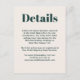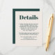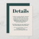 Fournissez à vos invités mariages les détails dont ils auront besoin autour de votre mariage. Ce design moderne et design moderne et tendance propose des textes audacieux et des choix de couleurs populaires. Montré ici en vert émeraude avec coordonnées ecru avec un ensemble de papeterie mariage et d'autres produits pour votre journée ou événement spécial. Vous pouvez éditer le modèle texte avec les informations de l'hôtel, les itinéraires, les rencontres spéciales et les réceptions et plus encore. Modifiez simplement le modèle de texte comme vous le souhaitez. Si vous avez besoin de replacer le texte après l'avoir customisé avec vos détails, vous pouvez le faire glisser vers l'emplacement pour le recentrer.