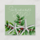 Climat chaud Noël fête ou carte de réponse mariage avec modèle de code QR. Les petites cartes carrés sont vert pin clair avec script blanc et étoile de mer avec conception sainte. Le libellé demande aux clients de scanner le code pour y répondre. Le code QR est téléchargé au verso de la carte.