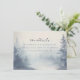 This wedding enclosure card features a serene, misty forest scene with tall pine trees in varying shades of blue-green, creating a dreamlike and tranquil atmosphere. The design employs a watercolor or digital painting style, characterized by soft edges and gentle blending of muted blues and grays, evoking a cool, peaceful mood. Elegant script typography highlights the phrase "the details," while simpler serif font provides additional information, ensuring readability and sophistication. The overall layout is centered and well-spaced, utilizing negative space effectively to focus attention on the text, making it perfect for conveying important wedding information with an inviting tone.