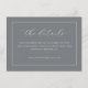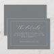 Cette carte d'insertion de mariage présente un design minimaliste et élégant avec un fond gris uni encadré par une fine bordure blanche. La mise en page est épurée, mettant l'accent sur la simplicité avec un espace négatif généreux autour des éléments de texte centrés. La typographie combine un script cursif élégant pour "les détails" avec une police sans-serif simple pour les informations complémentaires, créant une esthétique sophistiquée mais claire. Parfaite pour transmettre les détails essentiels de l'événement, cette carte dégage une atmosphère de sophistication et de clarté, ce qui la rend idéale pour les mariages modernes qui apprécient l'organisation et l'élégance discrète.