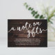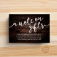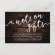 Célébrez le début de votre voyage ensemble avec notre thème élégamment rustique de chalet rustique moderne avec fond en bois foncé, carte incluse avec invitation de mariage "Un mot sur les cadeaux", vœu, argent liquide. Dotée d'un mélange sophistiqué d'écriture moderne et d'un charme romantique, chaque carte est méticuleusement conçue pour transmettre l'essence de votre jour spécial. Parfaitement adaptée aux couples qui cherchent une façon unique de partager leurs rêves de lune de miel, cette carte invite vos proches à contribuer à des expériences inoubliables. Qu'elle soit nichée dans une enveloppe luxueuse ou présentée avec vos invitations de mariage, notre carte ajoute une touche d'enchantement à votre célébration, promettant des souvenirs précieux qui dureront toute une vie. Conçue par TeeshaDerrick.