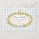 A charming vintage baby shower design featuring a sweet watercolor bunny resting above a delicate spring garden wreath. Soft daisies, greenery, and tiny carrots form a whimsical botanical frame, finished with a gentle ribbon bow and a soft blue gingham background. The storybook illustration style and pastel countryside palette create a timeless cottagecore aesthetic that feels warm, playful, and perfect for celebrating a new little arrival.