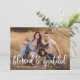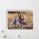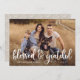 Chic carte photo Thanksgiving avec votre photo horizontale pleine saignée avec "béni & reconnaissant" dans une superposition de script blanc et écrit à la main. Personnalisez l'unique carte Thanksgiving en ajoutant votre nom et l'année. La carte revient pour présenter un motif de feuillage blanc de style Farmhouse contre un arrière - plan beige.