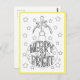 Typographie "Joyeuse et Lumineuse" pour page de coloriage à l'intérieur d'un ornement suspendu, avec des étoiles tout autour. Peut être envoyé par la poste ou accroché comme décoration murale sur le réfrigérateur. Activité de divertissement idéale pour les enfants comme cadeaux de fête, les enseignants pour activité d'élève, ou envoyée aux grands-parents de la part de l'enfant. Cette carte a une bordure jaune vif.