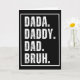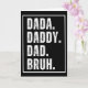 Dada Daddy Dad Bruh est une typographie amusante rétro en détresse des quatre étapes des noms qu'un homme sera appelé en élevant des enfants. Une carte drôle de Fête des Pères pour un dada, papa, père spécial. Message à l'intérieur qui se lit Merci d'être toi, et peut être personnalisé avec votre propre message spécial. Texte Joyeuse Fête des Pères peut également être personnalisé avec votre propre sentiment.