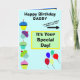 Happy Birthday DADDY est écrit en typographie rouge et noire contre un arrière - plan bleu turquoise clair avec ballons colorés. La vanille délicieuse et les cupcakes décorés au chocolat. C'est votre journée spéciale est écrite sur un rectangle géométrique vert et jaune sauge clair. A l'intérieur de gauche a des voeux d'anniversaire à DADDY en typographie bleue et des ballons volants. Zone encadrée bleue et noire avec arrière - plan jaune clair pour l'enfant à écrire à la main leur propre petit message et/ou faire un dessin. Oeuvre et design d'origine © TamiraZDesigns.