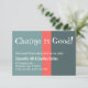 Dans cette pièce amusante, une police ludique a été utilisée pour rendre les mots "Change is Good!" et "Stay in Touch!" sur le dos. Vos détails apparaîtront dans une police sans-serif complémentaire. J'ai ajouté des blocs de couleurs et une palette de couleurs gris-vert et saumon aux arrière - plans pour un plaisir unique. Toutes les couleurs et les polices peuvent être modifiées si vous le souhaitez.