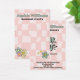 Cette charmante carte à bijoux présente un arrière - plan à damiers rose et blanc ludique aux fleurs rétro. La police est un style rétro vintage en gras entièrement personnalisable dans l'outil d'édition de conception. Le dos comprend un message chaleureux de "Merci", ainsi que de l'espace pour les coordonnées comme le site Web de votre boutique, le courriel et le numéro de téléphone. Parfait pour présenter vos bijoux faits main avec style et ajouter une touche personnelle amusante.