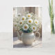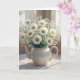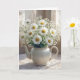 A teapot vase brimming with daisies and baby's breath sits on a lace-covered table, bathed in a warm glow from sunlight filtering through the window.