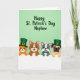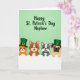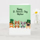Cette carte montre quatre amis animaux de style cartoon qui regardent par-dessus une ligne horizontale blanche sur un fond dégradé vert doux, donnant à la scène une atmosphère cosy et amicale 💚. Un chat orange, un chien marron, un chien gris et blanc tacheté et un chien fauve au museau court se penchent les uns vers les autres, leurs larges sourires et leurs yeux sombres brillants suggérant un lien facile comme des amis proches partageant une plaisanterie. Le chat orange et le chien au museau court portent des chapeaux hauts de forme émeraude avec de petites boucles dorées, ajoutant une touche festive sans surcharger les personnages. Le chien tacheté porte un nœud papillon vert, et le chien marron porte un petit charme en trèfle doré qui ressemble à un petit cadeau attentionné entre copains ☘️. Dans la partie supérieure, le message « Joyeux St. Patrick's Day Neveu » apparaît en lettres arrondies, sur un vert plus foncé qui se détache clairement du fond plus clair. Le texte est centré près du haut, laissant suffisamment d'espace pour que les visages et les chapeaux des personnages attirent l'œil. Un ombrage lisse et des contours simples maintiennent l'attention sur leurs expressions et la façon dont ils se regroupent