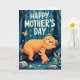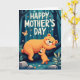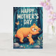 Conçue avec une scène forestière de rêve, la carte montre deux animaux ressemblant à des ours partageant un moment tendre dans une forêt calme ❤️. Une figure plus grande et robuste est allongée sur une branche épaisse et sombre, portant un sourire doux avec des joues roses et une posture détendue qui semble chaleureusement protectrice. En dessous, un petit ourson se tient debout sur le sol forestier, étendant ses petits bras vers le haut comme s'il demandait un câlin ou essayait de toucher celui du dessus. Les personnages sont ombrés dans une douce lueur orange qui se détache sur les troncs d'arbres de couleur sarcelle foncée et indigo et les feuilles ombragées, donnant à la scène une atmosphère cosy et retirée. Quelques petites fleurs blanches et orange clair parsèment les zones inférieures, ajoutant une touche douce et attentionnée 🌼. Près du haut, un court message pour la fête des mères est centré en lettres crème, avec des mots espacés pour respirer sur le fond sombre. Un seul papillon flotte près du texte, et les textures de la forêt semblent
