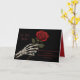 Une carte de vœux sombre et romantique représentant une main de squelette tenant une seule rose rouge, avec la phrase "Amour qui hante" dans une police d'écriture effrayante et un message poétique en dessous.