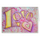Aquarelle peinture du mot jaune doré "Amour" avec un double coeur. Le rose et le violet soulignent les lettres et le coeur. Un léger coup de parties scintillant sur le dessus donne au tableau une lueur brillante.