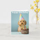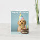 une jolie carte d'anniversaire pour les amateurs de cockapo dans votre vie ou pour ceux qui aiment les chiens mignons. chien mignon avec casquette rayé arc-en-ciel avec un délicieux gâteau d'anniversaire au chocolat avec des bougies