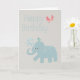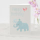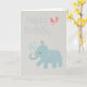Un éléphant de bleus layette a l'eau de pulvérisation d'amusement pendant qu'un petit oiseau mignon se repose sur une sa tête et des flottements différents ci-dessus. N'importe quel enfant en bas âge aimera cette carte. © Chris Gibson 2015.
