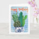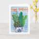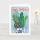 Une carte d'anniversaire tendance avec un grand cactus vert et un pot chinois bleu sur un fond rayé bleu