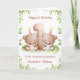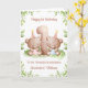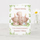 Cette carte d'anniversaire de 1 an convient pour des jumeaux fille et garçon. Le design comprend une bordure de verdure à l'aquarelle, le chiffre 1, et deux ours en peluche marrons avec des ballons d'anniversaire et des chapeaux de fête.