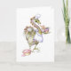 carte d'anniversaire avec un dragon à pois de polka en tablier et un casquette de boulanger allumant des bougies sur un gâteau