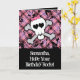 La conception de la carte d'anniversaire, en noir et rose, est amusante et comporte un crâne et des os croisés avec un arc rose sur la tête, et des coeurs pour les prises de vue. Parfait pour l'ado ou la fille pré-ado qui est dans l'emo grunge, ou pour célébrer son anniversaire spécial. Arrière - plan de plaid rose-chaud avec éclaboussures de peinture noire. Customisez-le avec votre propre nom ou texte pour cette touche spéciale ajoutée. Ce design est disponible comme une collection complète comprenant vêtements, produits de boisson, accessoires, cadeaux uniques et plus encore!