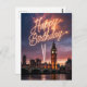 Une image spectaculaire et festive représentant l'horizon emblématique de Londres au crépuscule, centrée sur la tour Elizabeth (Big Ben). Le ciel est un magnifique mélange de rose, de violet et d'orange au coucher du soleil. Le point focal est la phrase "Joyeux Anniversaire" écrite en lettres de traînées lumineuses au-dessus de la ville, complétée par des feux d'artifice de célébration.