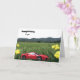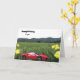 Pics de montagne avec un champ herbeux et des fleurs jaunes sauvages. Une voiture de sport rouge vif est mise en vedette. Souhaitez un joyeux anniversaire à quelqu'un.